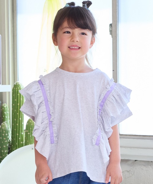 【BIG FIELD】夏のガーリーコーデにピッタリ♪細かいギャザーたっぷりのフリルが目を引きます♪袖部分から裾に向かって贅沢に縫い付けられています。ギャザーラインのカラーテープ配色がたまりません。このテープがコーデのアクセントになって可愛いですよね♪デニムやカーゴパンツなどを合わせて甘辛MIXコーデもオススメ!夏にピッタリなカラーもおすすめポイントです。■モデル着用アイテムショートタックパンツ:0110141027★商品タグのカラー表記オフホワイト→オフホワイト杢