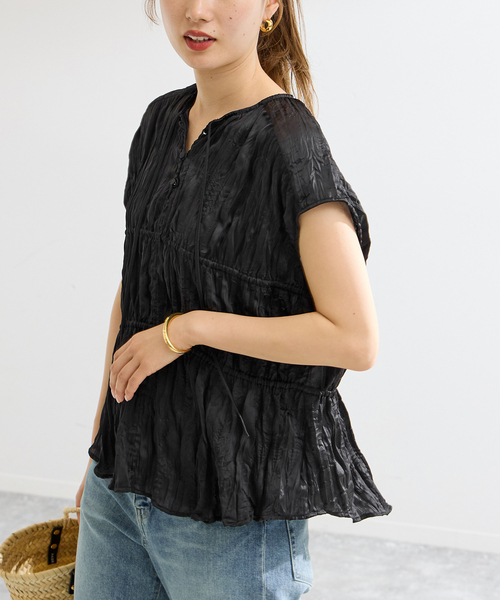 VMID:981770572 カジュアルに着こなせるサテントップス。 つやっとした光沢感のある素材に、ランダムにプリーツをかけることでカジュアルな印象に。 肩にかかるフレンチスリーブで、腕をすっきりと見せてくれる効果が期待できます。 ボタンは開閉ができるので、顔周りをすっきり見せる着こなしもおすすめ。 ********************** 透け感:なし 裏地:なし 伸縮性:ややあり 光沢感:あり 生地の厚さ:普通 ********************** ※取り扱いについては、商品についている品質表示でご確認ください。 ※こちらの商品は、FRAMeWORK での取り扱いになります。 直接店舗へお問い合わせの際は FRAMeWORK 店舗へお願い致します。 ※照明の関係により、実際よりも色味が違って見える場合があります。 またパソコン・スマートフォンなどの環境により、若干製品と画像のカラーが異なる場合もございます。 予めご了承の上ご注文ください。 ※商品の色味は、商品アップ画像をご参照ください。 本体:手洗い可能