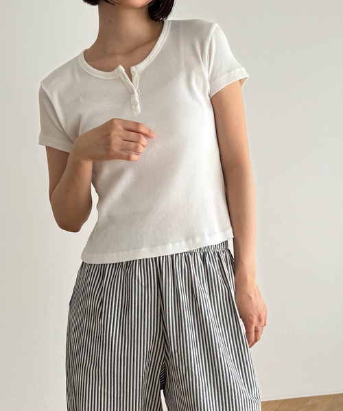 デザイン 首元のヘンリーネックがポイントの半袖Tシャツ。 コンパクトなサイジングでカジュアルになりすぎず女性らしい印象に。 素材 リブ素材で伸縮性があるので、コンパクトながらストレスなく着ていただけます。 コーディネート デニムやイージーパンツを合わせたカジュアルスタイルから、スラックスなどを合わせた綺麗めスタイルまで。 ボトムスを選ばず様々なコーデに活躍してくれます。 El mar(エルマール) El mar はスペイン語で『海』 海に向かうときはだれでもワクワクする。 洋服を選ぶとき、袖を通すとき、 同じように心が踊るアイテムを提案したい。 そんな『ワクワク』な気持ちを込めて El mar はデビューしました。 ------------------------------------- 生地の厚さ:厚い〇〇●〇〇薄い 伸縮性:あり 透け感: 裏地:なし 光沢:なし ------------------------------------- 取扱い ・おしゃれ着洗剤をご使用ください。 ・クリーニングネットをご使用ください。 ・濃い色と白 ・淡色物は分けて洗ってください。 ・素材の特性上、摩擦に弱く特に湿潤時に受ける摩擦は変色や白化の原因となります。脱水機は使用せずに、軽く押し洗いをし、タオルを挟んで水分を取り、形を整えて陰干ししてください。 ・洗濯で多少縮むことがあります。洗濯後はすばやく形を整えて干してください。タンブラー乾燥はお避けください。 ・アイロンの際は当て布をご使用ください。 ・着用時の汗や摩擦により、他の衣類や鞄などに色移りすることがありますので、淡色系との着合わせはご注意ください。 ・摩擦や引っかけにご留意ください。 ※取り扱い及びお手入れ方法については、商品についている取扱表示、洗濯表示にてご確認下さい。 ※照明の関係により、実際よりも色味が違って見える場合があります。またパソコン・スマートフォンなどの環境により、若干製品と画像のカラーが異なる場合もございます。 ※商品の色味は、商品アップ画像をご参照ください。