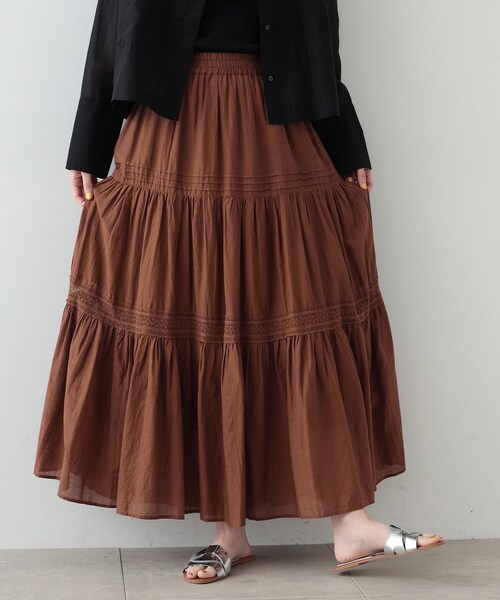 Design Point裾に向かってふんわりと広がるラインで、たっぷりとボリューム感を持たせた軽やかな印象のスカート。切替部分にレース・ピンタックを入れ、レディームードを漂わせたカジュアルにも着回せる一枚です。Styling Pointシンプルなトップスとのスタイリングが映えるティアードスカート。Fabric Point軽やかで着心地のいい柔らかなインド綿を使用。※照明の関係により、実際よりも色味が違って見える場合があります。また、パソコン・スマートフォンなどの環境により、若干製品と画像のカラーが異なる場合もございます。店舗へのお問い合わせ商品番号:523-78007●製品寸法:34(XS):総丈91cm W62cm 裾幅185cm38(M):総丈93cm W68cm 裾幅195cm備考: