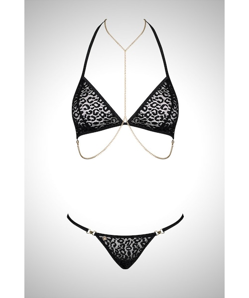オブセッシブ ブラ&ショーツセット チェーンの優雅な輝きで魅せるブラ&タンガ モノトーンのパンサー柄がシックなブラジャーとタンガのセット。デコルテを飾るハーネス風のチェーンがデザインのポイントに。ハードになりがちなスタイルをシアーなファブリックとゴールドの温かな輝きでスタイリッシュに仕上げました。リッチな印象で着こなせるインポートならではのセクシーランジェリーをお楽しみください。 ミニマルなパターンのタンガにもゴールドの金具とチェーンを配しエレガントに。バックに配した3本のチェーンが動きに合わせて光を放ち腰を官能的に彩ります。しなやかに獲物をしとめるパンサーのような優雅なルックスでパートナーを翻弄して。