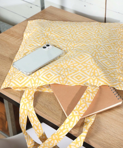 自然にあるモチーフを柄にしたトートバッグ。 インドの伝統的なプリントをあしらった生地を使用した エスニックな魅力のあるデザインになっています。 バッグの個性的な縫製や、フラットタイプで肩掛けしても かさばらないところもポイントです。 【HAND BLOCK PRINT from India】 「ブロックプリント」とは、木彫りの木版で布にインクを捺していくインドの伝統的な技法です。 複数の木版を使用し、1色ずつ捺しては乾かし色を重ねていくことで様々な模様が生み出されます。一般的なプリントとは違い、版ずれ、にじみ、色ムラがありますがそれは職人による手作業の証です。 ※プリント部分はかすれやにじみ、インク飛びが見られる場合があります。特性としてご理解ください。 ※重すぎるものは入れないでください。