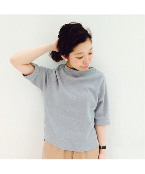 Kastane(カスタネ) この時期マストに使える1枚。首元のデザインがポイント。ワッフル生地で着心地◎裾の長さは前後アシンメトリーになっていてお尻が隠れる丈がうれしい。5部袖なので今すぐ着ていただけます。