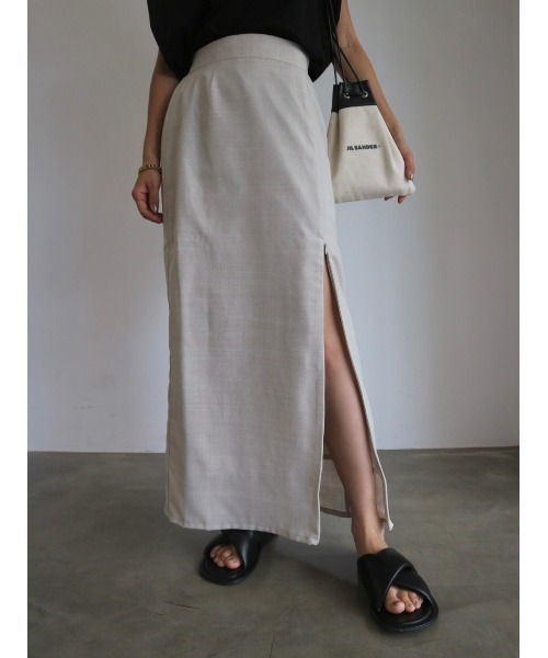 【Item Comment】 リネンライク素材を使用したロングスカート。 ファスナーの開閉によって スリットの高さを調節できる仕様なので、 お好みに合わせた着こなしが楽しめる一着です。 シワになりにくく速乾性に優れており、 軽やかで涼しいのでこれからの時期にぴったり。 同色の裏地付きなので透け感も軽減され、 ウエストはバックゴム仕様で ストレスフリーな着心地も嬉しいポイント。 すとんと落ちたタイトシルエットが、 カジュアル見えしがちな夏のコーディネートを 女性らしい雰囲気にしてくれます。 【Coordinate】 ウエスト部分のフロントは、すっきりとした仕様なので トップスをINしてメリハリをつけたスタイルがおすすめ。 ワントーンコーデで仕上げていただくのも◎ 【Color Variation】 IVORY/BLACK ※着用画像は実際の商品とお色味が多少異なる場合がございます。 【Material】 裏地:■あり □なし 厚み:□薄手 ■普通 □厚手 透け感:■IVORYのみややあり □なし 伸縮性:□あり ■なし 光沢感:□あり ■なし 【Model】 Director(佐野真依子):162cm 【 “お気に入り登録”でお買いものが便利に! 】▼商品のお気に入り登録完売カラーの再入荷時や、ラスト1点の時、セール開始時にお知らせします。 ▼ブランドのお気に入り登録新商品や再入荷、セール情報など、 いち早くTRUNC88のお得な情報を受け取ることができます。ぜひご活用ください。