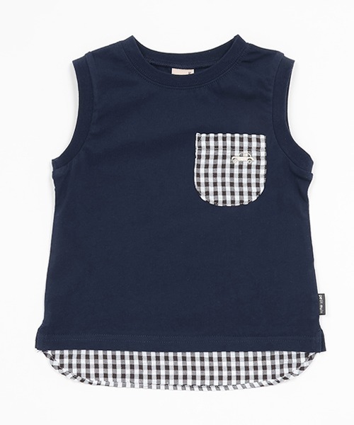 裾に別布をドッキングしてレイヤード風に見せたタンクトップです。刺しゅうデザインのベージュとライトグレー、ミニポケットがついたライトオレンジと紺のアソート展開。一枚で着てもサマになるデザイン性の高い一着です。やさしい肌触りの綿素材で着心地も快適。内側にお名前を記入できるタグつきです。【透け感】透けない【生地の厚さ】普通【伸縮性】あり【裏地】なし【ポケット】あり