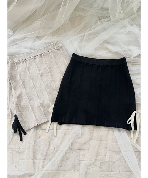 サイドのリボンがフェミニンなニットスカートです。柔らかく伸縮性の良いニットを使用し、脚が長くキレイに見えるようサイズ調整しました。同素材のトップスに合わせて着るのはもちろん、ブラウスに合わせた大人ガーリーコーデもオススメです。