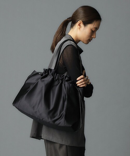 デイリーや旅行でも活躍する大きめのトートバッグ 【デザイン】 LUINIシリーズの特徴である絞りのデザインはそのままに、左右に外ポケット・開き口にはマグネットと機能も兼ね備えました。 コードを絞ってギャザーを寄せてもよし、そのままでシンプルなトートバッグとしても楽しめます。 ハンドルやコードがレザー素材なのでカジュアルになり過ぎず、嵩張らないので旅行の際のサブバッグとしても便利。 両サイドに外ポケットが2つ、バッグの中にもポケットが3つ付くので使い勝手の良さもポイントです。 デイリーからレジャーまで幅広く活躍してくれます。 ※ポケット数:外側×2 内側×3 【素材】 適度なハリと肉感、上品な光沢感が特徴のドレスサテンを使用。 ソフトな牛革スムースを合わせました。 ※サテン生地はカラーにより素材が異なります。 ※照明の関係により、実際よりも色味が違って見える場合があります。また、パソコン・スマートフォンなどの環境により、若干製品と画像のカラーが異なる場合もございます。 モデル情報:身長171cm B80 W59 H88 店舗へのお問い合わせ商品番号:709-21126 ●製品寸法: 00(FREE):高さ34.5cm 幅(上部)52cm 幅(下部)40cm マチ13.5cm 持ち手上がり22.5cm 備考:重量:約325g(サンプルサイズ)