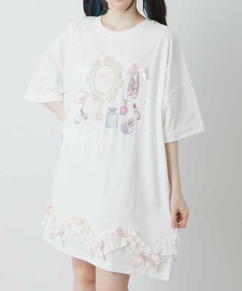 プードル&コスメの絵柄で、ガーリームードを醸し出すBigTeの登場です♪ 胸元に、プードル&コスメのデザインが、ONされて、可愛らしく、クラシカルな雰囲気を演出します。裾には、リボン&フリルのあしらいがあり、甘いアクセントがきいて◎ 身幅を持たせて、スリーブもたっぷりとし、抜け感があるシルエットで、鮮度が高まるアイテムです☆