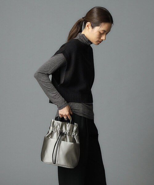 人気のLUINI(ルイーニ)シリーズをドレープの美しいサテン生地で仕立てました。【デザイン】定番の素材とは異なり、ドレープ性のあるサテンで上品に仕上げました。直線的でミニマルなカットにギャザーの丸みがポイント。上品なポリエステル素材にポイントでレザーを組み合わせた、カジュアル過ぎないお洒落なバッグです。ショルダーストラップは結び目を変える事で長さの調整が可能で、バッグの中にしまえばハンドバッグにもなる2way仕様。ペットボトルや長財布もすっぽり入る容量ながら、コンパクトな見た目に作りました。軽く、普段の買い物からちょっとしたお出掛けまで気軽に持てるほか、嵩張らないため旅行でも活躍します。※ポケット数:外側×2 内側×3【素材】適度なハリと肉感、なめらかな手触りの上品な光沢感が特徴のドレスサテン(ポリエステル)の素材です。※サテン生地はカラーにより素材が異なります。※照明の関係により、実際よりも色味が違って見える場合があります。また、パソコン・スマートフォンなどの環境により、若干製品と画像のカラーが異なる場合もございます。モデル情報:身長168cm B76 W58 H86店舗へのお問い合わせ商品番号:709-21127●製品寸法:00(FREE):高さ27.5cm 幅(上部)8~27cm 幅(下部)22cm マチ11.5cm 持ち手上がり6cm ショルダー全長114.5cm備考:重量:約200g(サンプルサイズ)