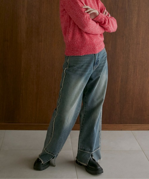 ◆Detail サイド・裾のフリンジにプラスしてフロント裾スリットのディティールが凝ったデザインデニム。 シルエットはややワイドなストレートシルエット◎ ハイウエストデザインなので脚長効果も抜群です。 ◆Fabric ------------------------------- 透け感:なし 伸縮性:なし 光沢:なし ポケット:あり 生地の厚さ:★★★☆☆ お手入れ方法:洗濯機洗い可 (30℃限度/弱洗濯) ------------------------------- ※デニムの特性上、染料の特有の匂いがある場合がございます。また人によっては染料のニオイが多少強く感じられる場合がございます。 ※汗や水、摩擦により他のものに色移りすることがありますのでご注意ください。 ※濃色製品は色移りすることがありますので、他の物と分けて洗濯してください。 ※生産時期によりサイズや質感・色味に若干の個体差がみられる場合がございます。 ※商品画像は、光の当たり具合やパソコンなどの閲覧環境により、実際の色味と異なって見える場合がございます。 予めご了承ください。 ※着用、お取り扱いの際は、商品についている品質表示とアテンションタグを必ずご確認ください。 ◆Information 欲しいitemをお気に入り登録(♡マークをclick) ・お買いのがし対策…完売itemの再入荷やラスト1点の情報をお知らせ ・欲しいitemをお得にget…pricedownになったらいち早くお知らせ ・スムーズ検索…ZOZOのお気に入りアイテムページで簡単checkできるから、再検索不要♪
