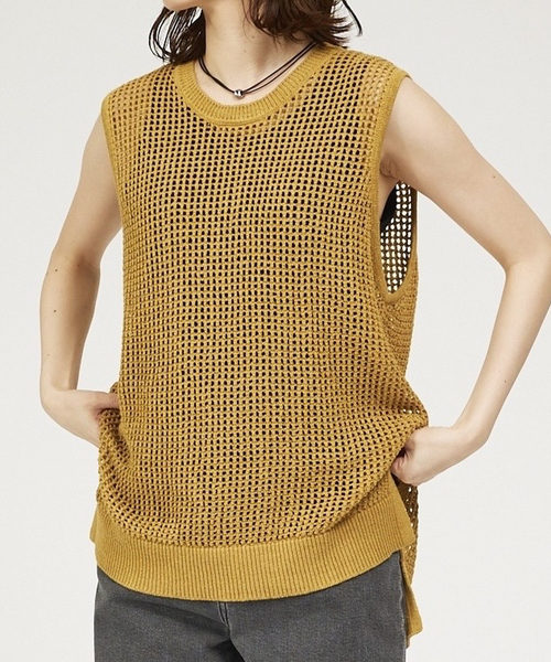 秋まで使える涼しげニット【Design】今年らしいメッシュの編み柄がポイントのサマーニットトップス。程よくインナーが透けるので、レイヤードコーデのバリエーションが楽しめる1枚です。ゆったり目のサイズ感でセクシーになりすぎないのも嬉しいポイント。【Fabric】清涼感のある綿ナイロンのテープヤーンを使用。さらっとした肌触りがじめじめする夏にぴったり◎トレンド感のあるメッシュ編みで通気性にも優れています。【Styling】ヘルシーにキャミやタンクにサラッと合わせたり、ベストとしてTシャツやブラウスの上に重ねても◎インナーを変えて秋冬まで長く活躍します。