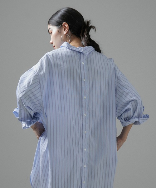長めのチュニック丈で1枚着としてもレイヤードアイテムとしても幅広く活躍するアメリカーナのオーバーシャツ ============================= こちらの商品は、SALON adam et rope' (サロン アダム エ ロペ) 取り扱い商品です。 ============================= ■デザイン/シルエット ゆったりとしたメンズライクなサイズ感に、大胆なスリットが女性的なAmericanaのオーバーサイズシャツ。 こちらはスタイリングのポイントになるストライプ柄です。 洗いざらしのような質感のコットン素材で、ゆとりのあるシルエットです。 長めのチュニック丈なので気になる腰やヒップ周りも体型カバーしてくれます。 バックボタンや袖のさり気ない刺繍ロゴなど、シンプルながらもデザインポイントが散りばめられています。 程よい抜け感と後ろから見たデザインのムードなど、トラッドでありながら女性らしさあふれる1枚です。 爽やかなブルーストライプの1色展開です。 ■コーディネート 1枚着はもちろん、長めの着丈なのでニットやカーディガン、スウェット等をレイヤードしてもオススメです。 ショートパンツやミニスカートを合わせてワンピースのように着ても◎ バックボタンも開くので裾だけ開けて着用すること等も可能です。 ■同型の無地もございます。 商品番号:SBH64060 商品名:【Americana(アメリカーナ)】タイプライタークロスロングシャツ/無地 【メーカー型番・カラー・サイズ】 型番:AL-S-434 ST サイズ:F カラー 45ブルー:ブルーストライプ ※サイトカラー表記とメーカーカラーが異なる場合がございますので 必ずこちらをご確認お願いします。 ■モデル身長:172cm 着用サイズ:F ----------------------------- 裏地:なし 光沢感:なし 透け感:なし ポケット:なし 伸縮性:なし 生地の厚さ:やや薄手 -----------------------------