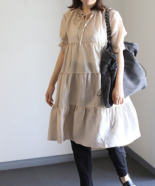 ふんわりとしたティアードデザインで大人可愛いカジュアルコーデが完成。 軽量で着心地も抜群。 ほんのり光沢&シアーで華やかさも。 [サイズ(cm)] M:総丈91 バスト116 肩幅34 裄丈35 [お手入れ方法] 手洗いにてお手入れしてください。