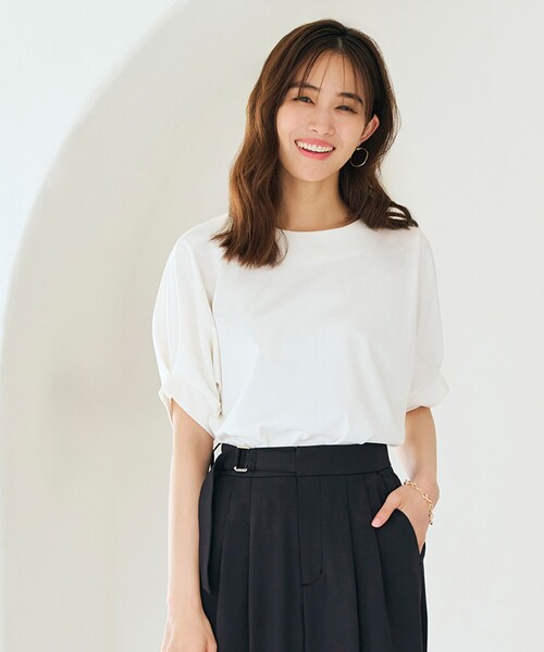 キレイめにもカジュアルにも!スタイリング次第でコーディネートの幅が広がるデザインTシャツ 【デザイン】 袖口にタックを施した程よくフェミニンなデザインTシャツです。 程よいボリューム感のデザインスリーブで甘くなり過ぎず上品な大人コーデが叶います。 バックにタックを施し後ろ姿も抜かりない1枚です。 【素材】 コットン素材にポリエステル糸をプレーティングした表面がきれいな仕上がりになる天竺素材を使用しています。 毛羽感がなくすっきりした素材なので、キレイめにも着こなしていただける1枚となっています。 夏に嬉しい接触冷感・UVカット機能付きです。 ※この製品は、太陽光線中の紫外線(UV)を通しにくくします。この効果は永久的ではありません。 【スタイリング】 キレイめからカジュアルまで幅広いコーデで活躍できるデザインTシャツです。 裾にスリットを入れており、イン・アウトどちらも楽しめるデザインです。 ※照明の関係により、実際よりも色味が違って見える場合があります。また、パソコン・スマートフォンなどの環境により、若干製品と画像のカラーが異なる場合もございます。 【24SS】 【24AW】 モデル情報:身長166cm B80 W59 H86 着用サイズ:02(M) 店舗へのお問い合わせ商品番号:768-19300 ●製品寸法: 01(S):着丈60cm B97cm 裄丈38cm 02(M):着丈62cm B100cm 裄丈38cm 03(L):着丈64cm B103cm 裄丈39cm 04(LL):着丈66cm B106cm 裄丈39cm 05(3L):着丈68cm B109cm 裄丈40cm 備考: