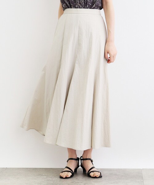 表情あるナイロン素材が今の気分 大人のフレアースカート 【デザイン】 スポーティムードあるナイロンワッシャー素材を使用したたっぷりボリュームのフレアースカートです。 軽さのあるナイロン素材を使用することで、たっぷりボリュームのあるロングスカートでも重すぎず、軽やかな印象で着用いただけます。 表情あるワッシャー加工を施して、味のあるムードが抜け感ポイントとなっています。 裾にかけてたっぷりフレアーを入れていますが、少しマーメイド調にくびれを入れることで腰回りはすっきりと穿けるドラマティックな仕上がりです。 ※ポケットなし 【素材】 軽さのあるナイロン素材を使用。 ワッシャー加工を施して味のある仕上りとなっています。 ※裏地あり 【スタイリング】 Tシャツやニットトップスと合わせて大人のリラックスフェミニンスタイルが完成します。 大人のデイリースタイルに1枚あると旬顔に仕上がるおススメのアイテムです。 ※照明の関係により、実際よりも色味が違って見える場合があります。また、パソコン・スマートフォンなどの環境により、若干製品と画像のカラーが異なる場合もございます。 【24SS】 【24AW】 モデル情報:身長166cm B80 W59 H86 着用サイズ:02(M) 店舗へのお問い合わせ商品番号:768-79001 ●製品寸法: 01(S):総丈86cm W63~86cm H111cm 02(M):総丈88cm W66~89cm H114cm 03(L):総丈90cm W69~92cm H117cm 04(LL):総丈92cm W72~95cm H120cm 05(3L):総丈92cm W75~98cm H123cm 備考: