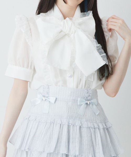 フリル&リボンタイで、ガーリームードが高まるブラウスの登場です♪ 首元に、大きなリボンタイのデザインが、ほどこされて、華やかさを演出し、好アクセントになります。ショルダーやフロントには、フリルが、あしらわれて、甘いニュアンスが加速◎ チュール素材で、透け感が増して、シーズンらしさをプラスし、上品な女の子スタイルにぴったりな一着です☆