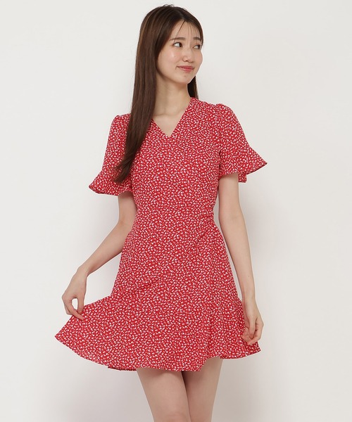 レトロな小花柄プリントが目を惹くフェミニンなミニワンピースカシュクールの大人っぽさとフリルの甘さがバランスの良い1点です。バックウエストのリボンを緩めたりきつくしたりと体形に合わせて調節が可能です。腕周りはほんのりボリュームのあるフリル袖で、気になる二の腕もカバー☆ラップデザインのスカートはアシンメトリーに段差をつけて、見た目にも新鮮さをプラスしてくれます。さらりと着れて、1枚でリゾートスタイルを演出できる、便利アイテムです。【styling】これ一枚でオシャレが叶うワンピース。ビーチスタイルに最適なワンピースなので、足元はサンダルで涼し気にコーデして◎キャップとスニーカーでカジュアルダウンしたコーディネートも、トレンドライクでおススメです。--------------------------透け感:なし裏地:あり伸縮性:なし生地の厚さ:薄い---------------------------F:着丈83.3cm バスト86cm 肩幅32cm 袖丈25cm ウエスト66cm