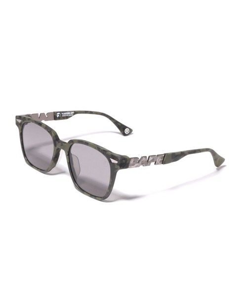 スクエア型のアセテート/ステンレスフレームサングラス。テンプルにステンレス素材のBAPE®ロゴ。左テンプルエンドにAPE HEAD、テンプルエンド右内側に®ロゴを配置。UV400プロテクション。ケースが付属。全3色。