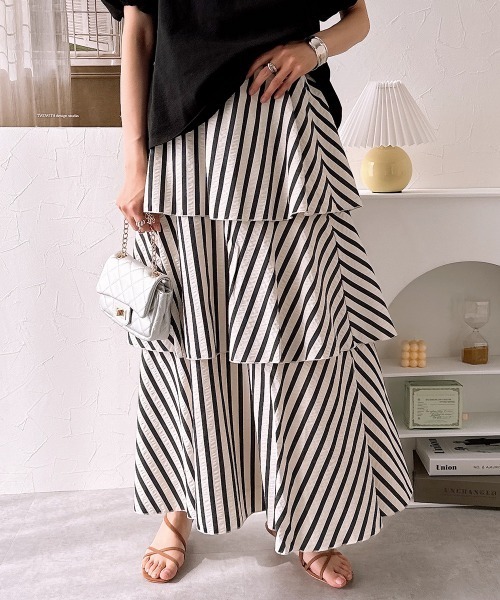 【Be praised】ーーー明日ちょっと褒められる服ーーー 大人トレンドを意識したこだわりのアイテムと着こなしでアナタの毎日に輝きを。 ただシンプルできれいなだけじゃ物足りない。 カジュアルすぎず、スタイリッシュで大人の品性を感じる着こなしに。 そんな、こなれたオシャレを楽しむ女性に寄り添う、 新鮮なリアルクローズをご提案します。 ボリューム感あり ストライプティアードスカート ■デザイン ・ストライプ柄×ティアードでボリューム感のあるスカート ・しっかり長めのデザインでインパクト有 ・気になるお尻周りも総柄とティアードでカバー ■素材 シャカシャカとした素材感で少し薄めの生地感 ■おすすめのスタイリング ボリューム感のあるスカートなので、トップスはシンプルなTシャツ1枚で◎ ウエスト部分もゴム仕様で着心地も楽々 <仕様> 【表地】ポリエステル50%・綿40%・レーヨン10%【裏地】ポリエステル100%(織物) ※照明の関係により、実際よりも色味が違って見える場合があります。 またパソコン・スマートフォンなどの環境により、若干製品と画像のカラーが異なる場合もございます。 予めご了承の上ご注文ください。 <洗濯方法> 手洗い ■キーワード 通勤カジュアル、オフィスカジュアル、大人カジュアル、大人、きれいめカジュアル、きれかじ、キレカジ、20代、30代、40代、ティアード、体型カバー、ストライプ柄、総柄、Aラインスカート、フレアスカート、マキシ丈、ロング丈、夏、春、裏地付、ウエストゴム