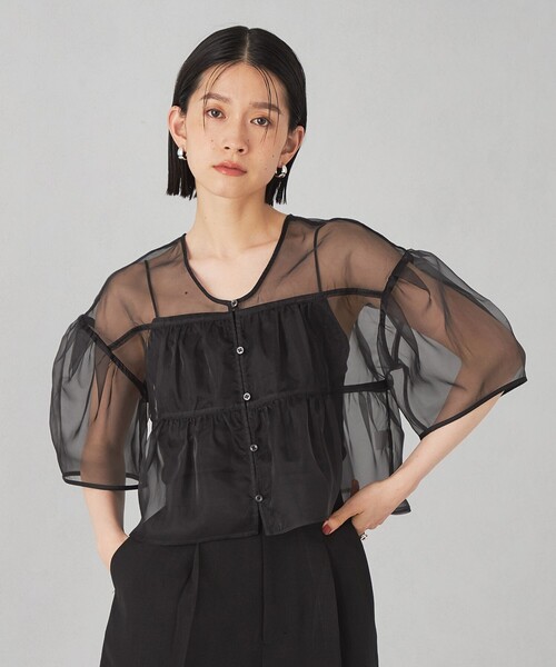 軽やかなシアーオーガンジーの前後2WAYブラウス ■デザイン ハリ感のあるオーガンジー素材とティアードデザインがモードでフェミニンな印象のブラウス。 前後2WAYで楽しめて、羽織としても使える便利なアイテムです。 ■素材 シアー感が楽しめるハリのあるオーガンジー素材。 ■コーディネート 短めの着丈でハイウエストボトムとの相性◎ デニムなどカジュアルなアイテムとの合わせがおすすめです。 #春服,#春物,#夏服,#夏物,#24SS,#シアー,#羽織り ============================ 裏地:なし 透け感:あり 伸縮:なし 光沢感:ややあり ケア方法:ドライクリーニング ============================ < EMMEL REFINES(エメル リファインズ) > Pleasure ~今を楽しみ、変化を楽しむ~ EMMEL REFINESは変化していく時代やトレンドを恐れなく前向きに楽しみ、 今に満足せず常に自分を更新していきたい、 自分らしさを表現したい女性に向けたブランドです。 女性の共感を大切に、時代にフィットした新しいスタイルを提案します。 【注意事項】 ※商品を使用前に、タグ等に記載されている「取り扱い上の注意書き」、「洗濯表示」を必ずご確認ください。 ※商品画像は、光の当たり具合やパソコンなどの閲覧環境により、実際の色味と異なって見える場合がございます。あらかじめご了承ください。 ※商品の色味の目安は、商品単体の画像をご参照ください。 お問い合わせの際は、ユナイテッドアローズ カスタマーサービスデスクまで下記の品名/品番をお申し付けください。 品名:EM オーガン 2WAY BL 品番:66166760971