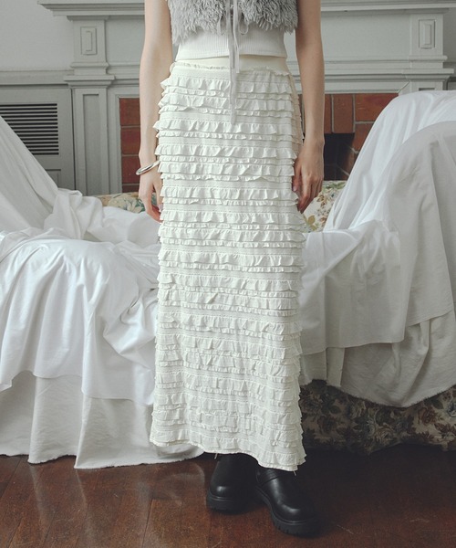 一気にトレンド感をアップ!フリルティアードスカート。◆2024-25 秋冬◆ 【デザイン・シルエット】 カットソーの履き心地とファブリックのようなキレイな見た目が特徴のフリルティアードスカート。 <POINT> ・ヒップから裾にかけても少しだけ広げているので体のラインを拾わないようシルエットを調整しています。秋からはブーツを履いていただいても、裾周りの足さばきがよい幅です。 ・表面変化のある生地がアクセントとなってシンプルなトップスとコーディネートしても映える一枚。 ・ウエストはゴム仕様でストレスフリーな着心地。 【素材】 カットソー素材で柔らかい着心地。 【カラー】 汎用性の高い ホワイト、ブラックの2色展開。 【おすすめのスタイリング】 腰回りはすっきりした見た目なのでインにしてもショート丈のものをアウトにしても着こなしができ、大きめなプルオーバーをアウトにすればリラックススタイルにも変身してくれる便利なスカートです。 ----------------------------- 裏地:あり 光沢感:ややあり 透け感:ややあり(ホワイトのみ) 伸縮性:あり ウエスト:後ろゴム、 ポケット:なし 生地の厚さ:やや薄手 季節:春、夏、秋 ----------------------------- 【モデル着用サイズ】 全色モデル身長:163cm、着用サイズ:F ※画像の商品はサンプルです。 実際の商品と仕様、加工、サイズが若干異なる場合がございます。 ※重量はサンプルFサイズの測量になります。サイズによって多少異なる場合があります。 ※画像によっては実際の色味と異なる場合があります。正しい色味は生地アップ画像をご確認ください。