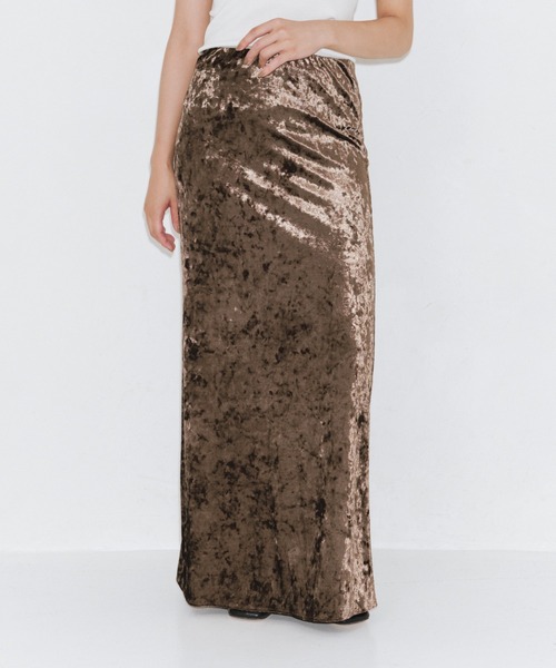 ベロア生地を採用したロングスカートが登場。柔らかい肌触りと動きとともに魅せる光沢感が 上品なムードを演出します。 見た目の美しさだけではなく保温性にも優れているので、秋冬に活躍するアイテムです。「Fancy skirt」をベースにしておりややマーメイドラインのシルエットは女性らしさを引き立たせ ほど良いストレッチ感があるので動きやすく、身体のラインを綺麗にみせてくれます。