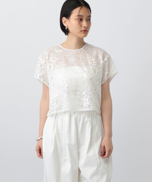 ーーー スパンコールのキラキラ感が主役級のトップス ーーー 【デザインと特徴】 スパンコールがしっかりと主張のある、目を引くデザイントップス。 シンプルなシルエットなので、いつものコーデにプラスしやすい1着です。 スッキリとしたコンパクトシルエットなので、ジャケットのインナーにも◎ 【素材特徴】 ・大小のスパンコールが装飾されているデコラティブな布帛生地 ・基布はジャカード柄がさりげなく入っており、雰囲気があります ・ほどよい透け感で夏らしく涼し気な印象 【お手入れ方法】 手洗いでお洗濯していただけます。 【スタイリング】 キラキラとデコラティブなTシャツなので、デニムやパラシュートパンツなど、カジュアルアイテムと合わせるのがおすすめです。 ジャケットのインナーにしてさりげないキラキラ使いもおすすめです。