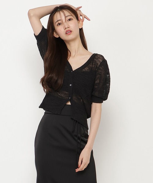 夏にオススメ!涼しげなシアーのサマーニットトップス スラブ風で表情のある糸を使用した、トレンドアイテムののシアーニットトップス。 夏向きの少しシャリっとした清涼感がある糸ですが、柔らかい編み地で着心地も良いです。 カジュアルながらも、ふんわりとした袖や幅広のウエストリブなどの女性らしいシルエットを取り入れました。 インナーキャミソールが付属しているので、中に着るものも迷わず便利です。 【styling】 羽織としてもトップスとしても使える、コーディネートの幅を広げてくれるカーデトップス。 ショート丈なので、ロング丈のスカートやパンツと合わせると、脚を長く見せてスタイルアップ効果◎ --------------------------- 透け感:あり 裏地:インナーキャミソールつき 伸縮性:あり 生地の厚さ:薄手 --------------------------- F:[カーディガン]着丈42cm バスト88cm 肩幅28cm 袖丈27cm [キャミソール]着丈41cm バスト72cm