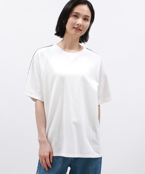 トレンドのラインデザインTシャツ。袖に太めに入った2本ラインがアクセントになり、合わせるだけでスタイリングを旬にしてくれる1枚です。ラグランデザインで肩回りも稼働しやすく、身幅にゆとりがあるのでラフな着心地もポイント。身幅や肩幅、袖丈は変わらずサイズにより着丈を変えた仕様に。ウエストが隠れる今年旬なクロプト丈、腰回りがカバーできるベーシックなロング丈、お好みの丈をお選びいただけます。【素材】ボディ部分は柔らかな着心地の綿100%素材。ラインはオフ11のみラメ入り。【スタイリング】合わせるボトムを選ばずスタイリングできます。1枚でもサマになりますが、ワンピースやサロペットのインナーとしても〇