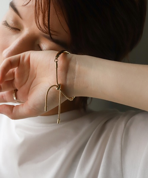 -point- & -styling- 程よい存在感でアクセントをプラスしてくれるスライドブレスレット。 太すぎず華奢なデザインがスっと肌なじみのよい女性らしい手元を演出してくれます。 スライドバーを動かしてお好みのチェーンの長さに調整が可能。 デイリー使いはもちろん、オフィスやフォーマルシーンでも活用してくれます。 ---------------------------- 素材 合金・真鍮 ---------------------------- ※モニター・環境等により実際の商品と多少色味が異なって表示される場合がございます。 予めご了承をお願いいたします。 ======================= ■袋梱包の為、染料による特有の匂いが抜けきれず、匂いがする場合がございますが不良品にはあたりません。 上記注意点での返品、交換はお断りします。ご了承の上お買い求めくださいませ。 ■本製品は生産過程におきまして色味、サイズ感等若干の誤差が出る場合がございます。予めご了承くださいませ。 ======================= 【お買いものをお楽しみいただく為に!】 ▼商品のお気に入り登録 完売カラーの再入荷通知や、ラスト1点の通知、セールの通知も受け取ることができます。 ▼ブランドのお気に入り登録 新商品や再入荷など、いち早くブランドのお得な情報を受け取ることができます!