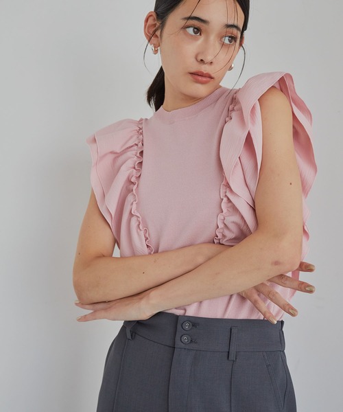 ドッキングフリルが印象的!コーデの主役間違いなしのニット。◆2024-25 秋冬◆ 【デザイン・シルエット】 コンパクトなニットに布帛ドッキングフリルディテールのついたニットトップス。 ニット部分は表面感のないものにしてフリルを目立たせたデザイン。 <POINT> ・斜めに入った布帛素材のフリルが顔回りを華やかな印象に。ギャザー分量はあまり大きすぎないため、程よい甘さをアピールできます。 ・天竺編みのさらっとしたドライタッチニット。 ・フリルが肩にかかるので華奢見え効果◎インしてもフリルが邪魔にならない位置に設定しています。 【素材】 肌障りの良い薄手の天竺編みニットと表面感のある布帛素材のドッキング素材。 気軽に洗濯機洗いができるイージーケア商品。 【カラー】 キナリ・ブルー・ピンクの3色展開。 【おすすめのスタイリング】 女性らしい甘さがあるニットなので、ボトムスはハンサムなイメージのデニムやスラックスパンツ合わせがおすすめ! ----------------------------- 裏地:なし 光沢感:なし 透け感:ややあり(キナリのみ) 伸縮性:あり 生地の厚さ:やや薄手 季節:春、夏、初秋 ----------------------------- 【モデル着用サイズ】 全色モデル身長:168cm、着用サイズ:F ※画像の商品はサンプルです。 実際の商品と仕様、加工、サイズが若干異なる場合がございます。 ※重量はサンプルFサイズの測量になります。サイズによって多少異なる場合があります。 ※画像によっては実際の色味と異なる場合があります。正しい色味は生地アップ画像をご確認ください。