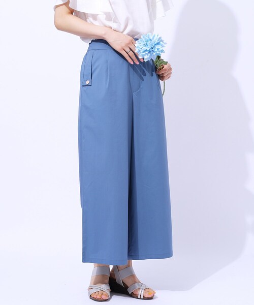 【デザイン】触れた瞬間ひんやりするひんやりする接触冷感機能が付いた8分丈のワイドパンツ。シンプルなシルエットにフラップポケットと金ボタンのデザインがポイントになっています。太すぎないワイドシルエットが今年らしい雰囲気。ウエスト後ろ部分はゴム仕様になっているので、楽に穿いていただけます。※ポケット数:横×2【スタイリング】きれいめのブラウス合わせたオフィスカジュアルスタイルがおすすめです。シンプルにTシャツを合わせ、大人カジュアルにも着ていただけます。幅広いシーンにマッチする1枚です。【お客様からいただいたコメント】・軽く涼しい素材で色も爽やかでよく、私の身長だと足首が出るので、夏らしい着こなししになったと思います。 (身長:168cm 体型:普通 ブルーのLサイズ購入) とのお声を頂戴しております。【素材】肌に触れるとひんやりする、接触冷感機能をあしらったコットン(綿)ブレンド生地を使用。UV機能付き。柔らかで着心地も良く、きれい見えの素材です。※裏地なし※この製品は、太陽光線中の紫外線(UV)を通しにくくします。この効果は永久的ではありません。※照明の関係により、実際よりも色味が違って見える場合があります。また、パソコン・スマートフォンなどの環境により、若干製品と画像のカラーが異なる場合もございます。モデル情報:身長166cm B81 W57 H86 着用サイズ:02(M)店舗へのお問い合わせ商品番号:741-69041●製品寸法:02(M):W64~72cm H94cm 股下57cm 前股上34cm 渡り幅33cm 裾幅33cm03(L):W68~76cm H95cm 股下57cm 前股上34cm 渡り幅35cm 裾幅34cm04(LL):W72~80cm H96cm 股下58cm 前股上35cm 渡り幅37cm 裾幅34cm備考: