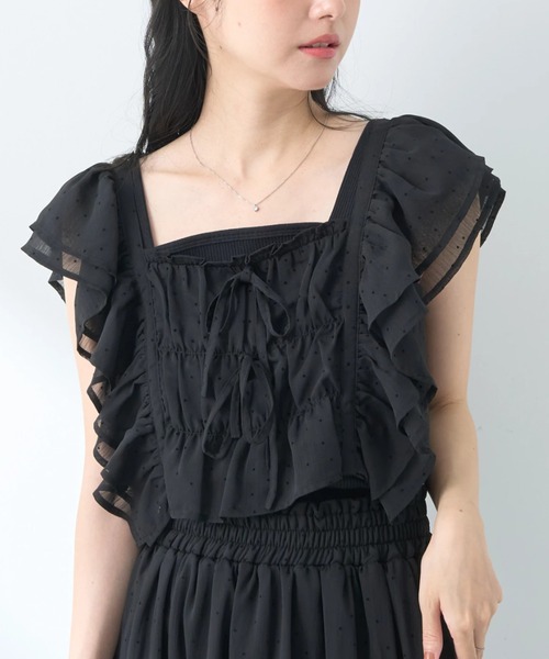 小さなフロッキードットを散りばめて、愛らしさたっぷりに仕上げたシアービスチェ。ふんわりとした軽やかなフリルと胸元のリボン使いが、スタイリングをキュートに演出してくれます。バックにも大きなリボンをあしらって、後ろ姿もぬかりなくデザイン◎レイヤードもおしゃれな着こなしに決まる大人可愛いアイテムです。同シリーズのスカートとセットで着用もおすすめ。 >同シリーズのセット着用おすすめアイテムはこちら 透け感[有り] 裏地[一部有り] 伸縮性[無し] 光沢感[無し] 生地の厚さ[薄手] 付属品[無し] ポケット[無し]●製品寸法:F:バスト[後ゴム仕様]40.0 cm 着丈37cm 袖丈11.5cm 裾幅47cm備考: