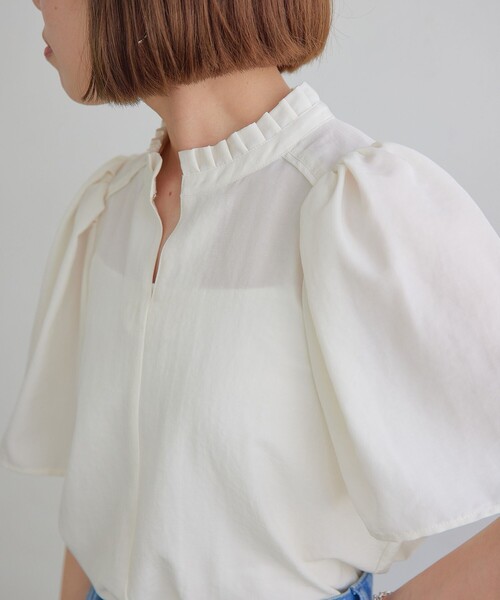 オンオフ着まわせる顔周りが華やかなデザインブラウス■デザイン細かいプリーツで作ったフリルの襟が顔周りのポイントになるデザインブラウス。甘さは抑えつつ華やかな印象で、軽やかに揺れるボリュームのある半袖が夏まで涼しげに着用いただけます。■素材きれいめにもカジュアルにも着まわしやすい、程よい落ち感とツヤを抑えた表面感のサテン生地を使用。■コーディネートワイドパンツやIラインスカートなど甘さを抑えた着こなしのオンスタイルや、デニム合わせのカジュアルな着こなしもおすすめです。#春服,#春物,#夏服,#夏物,#24SS,#半袖,#ショートスリーブ,#通勤,#オフィス,#オフィスカジュアル============================裏地:なし透け感:ややあり伸縮:なし光沢感:なしケア方法:ドライクリーニング・洗濯機洗い可============================< EMMEL REFINES(エメル リファインズ) >Pleasure ~今を楽しみ、変化を楽しむ~EMMEL REFINESは変化していく時代やトレンドを恐れなく前向きに楽しみ、今に満足せず常に自分を更新していきたい、自分らしさを表現したい女性に向けたブランドです。女性の共感を大切に、時代にフィットした新しいスタイルを提案します。【注意事項】※商品を使用前に、タグ等に記載されている「取り扱い上の注意書き」、「洗濯表示」を必ずご確認ください。※商品画像は、光の当たり具合やパソコンなどの閲覧環境により、実際の色味と異なって見える場合がございます。あらかじめご了承ください。※商品の色味の目安は、商品単体の画像をご参照ください。お問い合わせの際は、ユナイテッドアローズ カスタマーサービスデスクまで下記の品名/品番をお申し付けください。品名:EM プリーツエリ S/SL BL 品番:66166990976