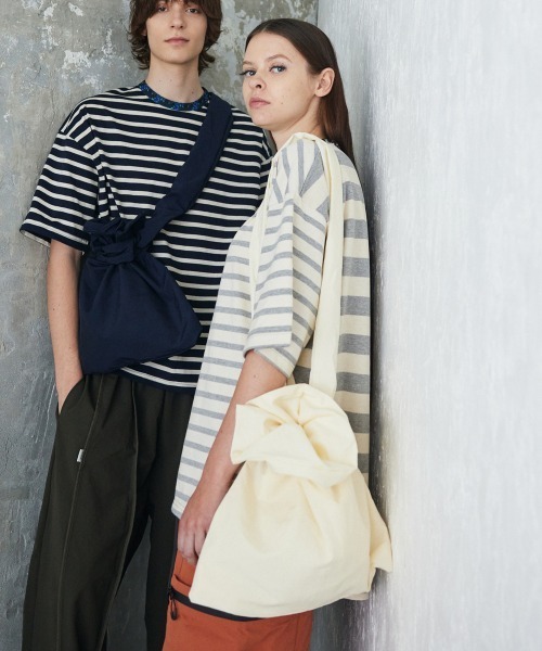【 生地 】 60%のコットンと40%のナイロンを組み合わせた高性能な混紡素材、60/40クロスを使用しています。 この特別なブレンドは、両素材の優れた特性を引き出し、バランスの取れた生地を実現しています。 コットンの自然な風合いと通気性に加え、ナイロンの耐久性と防水性が融合し、アウトドアウェアやギアに最適な素材として使用されています。 この生地は、撥水加工が施されているため、軽い雨や水滴を弾き、天候の変化にも対応します。 また、コットンの柔らかさとナイロンの強度により、快適な肌触りと長持ちする性能を提供します。 【 デザイン・シルエット 】紐の代わりにシュシュをイメージしたゴム入りの輪っかを口の部分に通して閉じるデザインが特徴的な巾着型バッグです。 ショルダー部分にはドローコードが通してあり、長さを調整することが可能です。 ドローコードを短くすることで、ワンショルダーバッグとしても使用でき、用途に合わせて様々なスタイルを楽しめます。 シンプルながらも機能性に優れたこのバッグは、カジュアルな装いにぴったりのアイテムです。