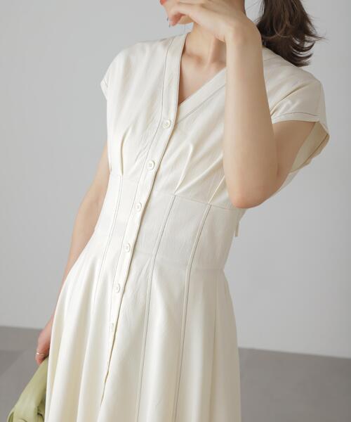(fabric&design) 配色ステッチがポイントのワンピースです。 少しシボ感のある生地を使用しているので綺麗になりすぎずない印象。 ウエストがシェイプされており、そこから広がるフレアシルエットがとてもきれいで一枚でスタイルアップできます。 襟元はV開きでデコルテが綺麗に見えます。 背中のデザインはドロストが可愛く背中あきの肌見せがヘルシーな印象に。 (styling) 一枚で可愛いワンピースなので小物合わせで楽しめます。 夏らしくハットと合わせても爽やかで、カジュアルに見せたい方はキャップにスニーカー合わせがおすすめです。 ■透け感:なし ■生地の厚さ:普通 ■裏地:なし ■伸縮性:なし ■光沢:なし ■シルエット:スタンダード --------------------------------------------------- ◆商品のお気に入り登録◆ お気に入りアイテムの値下げ・再入荷・在庫1点などの通知を受け取ることができます。 ◆ブランドのお気に入り登録◆ 新商品や再入荷、セール、クーポン配布などお得な情報を受け取ることができます。 --------------------------------------------------- ※ご注文いただいた予約商品のお届け時期の確認は、注文履歴ページより行えます。