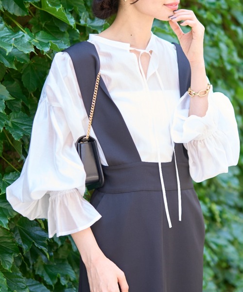 やわらかな透け感のある生地で、軽やかな表情のブラウス。後ろはお尻まで隠れる丈感とスリットで、ボトムとバランス良くコーディネートが可能です。気になる腕のボリュームをカバーしてくれる、ふっくらとしたキャンディ型の袖デザインが可愛らしく、コーデに取り入れるだけで、グッとエレガントなスタイリングに仕上がるアイテムとなっています。デートや会食などのちょっとよそゆきスタイルにも映える1枚です。袖にはゴムが入っているので、たくし上げてボリューム感を出して着るのもオススメ。デニムやチノパンなどカジュアルなパンツと合わせれば、甘すぎない大人な着こなしに。クリーニング方法:手洗い可【注意事項】※商品画像は、光の当たり具合やパソコンなどの閲覧環境により、実際の色味と異なって見える場合がございます。あらかじめご了承ください。※画像の商品はサンプルです。実際の商品と仕様、加工が若干異なる場合があります。※サイズ表記はあくまで目安となります。※その他の予約商品、通常商品との同時決済はできません。※入荷状況により、お届け予定が前後する場合があります。※お客様への発送が店頭販売より遅れる場合もあります。※追加生産商品は、一部の店舗、通販で販売中の場合がございます。予めご了承下さい。※商品の色味の目安は、商品単体の画像をご参照ください。※商品を使用前に、タグ等に記載されている「取り扱い上の注意書き」「洗濯表示」を必ずご確認ください。※商品に不良が無い場合、包装紙および箱の彼損がございましても発送いたします。あらかじめご了承ください。