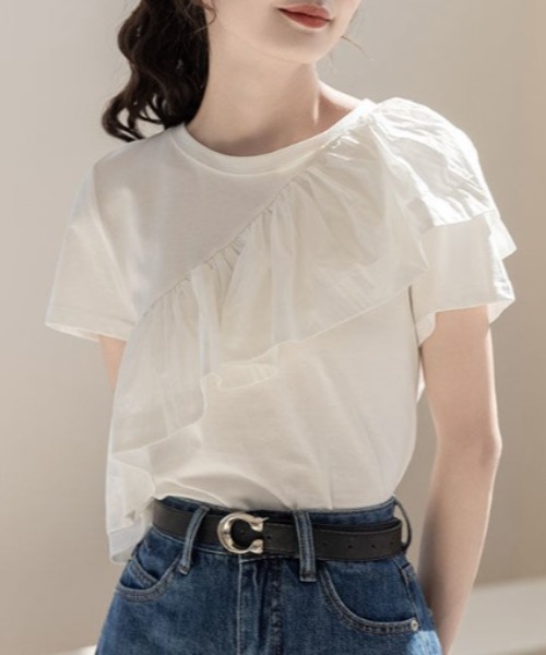 ななめに入ったフリルデザインがポイントのTシャツ。 フリルにボリュームがあるのでボディはコンパクトなシルエットに仕上げました。 シンプルなボトムに合わせてもおしゃれ見えを叶えてくれる嬉しいアイテムです。 ・・・・・・・・・・・・・・・・・・・・ 透け感:ややあり 厚さ:薄手 伸縮性:あり ・・・・・・・・・・・・・・・・・・・・ ※商品画像は撮影時の光や角度により、実物の色味と異なって見える場合がございます。 ※撮影はサンプル品を使用しており、表示のサイズ感も実物とは若干異なる場合もございますので、予めご了承ください。 ※生産時期により色・素材・サイズ感など多少異なる場合がございます。予めご了承ください。
