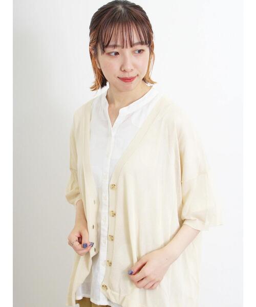 上半身をすっきりとした印象に見せてくれる深Vネックのカーディガン。前後差をつけた裾デザインも、スタイリングにこなれ感をプラスしてくれます。ゆるっとしたリラックスシルエットで羽織りやすいのもうれしいポイント。ご家庭でもお手入れしやすいマシンウォッシャブル仕様なのも魅力です。【その他採寸】F 着丈:[前]64cm[後]70cm