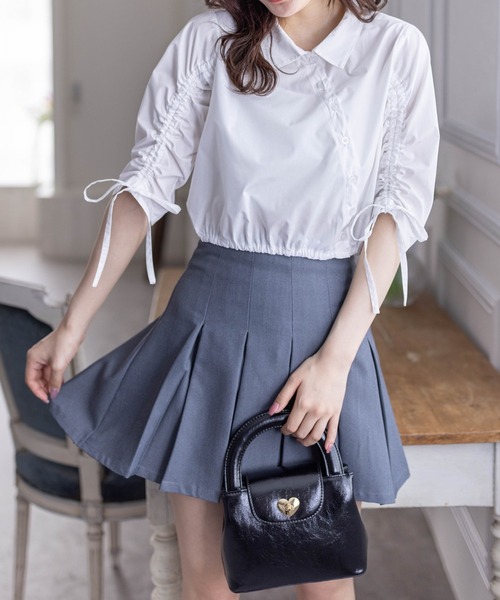 デザイン性のある!ショート丈袖シャーリングシャツ【デザイン】袖のシャーリングや斜めボタンなど特徴的なデザインのブラウスです。シャーリングで袖丈を調節できるので、長期間着ていただけます!ウエストにはゴムが入っているため、着痩せ効果があります♪【素材感】着心地の軽いポリエステル素材伸縮性:なし/ 透け感:オフホワイトのみ若干あり/ 裏地:なし手洗いによる洗濯可 / ドライ・ウェットクリーニング可【コーディネート】どんなボトムスとも相性抜群です!パンツ合わせでカジュアルにも、スカート合わせで甘めにも◎【※お取り扱い上のご注意】1:モニター環境等により実際の商品と多少色味が異なって表示される場合がございます。予めご了承下さい。2:屋外で撮影された商品は、天候により多少実際のカラーと異なる場合があります。商品のカラーはトルソー(マネキン)の商品画像をご参照ください。3:濃い色の商品は、お洗濯や摩擦等による移染にご注意ください。4:末永くご愛用頂く為に、アテンションタグ・洗濯ネームを必ずご確認の上、着用又はお取り扱い下さい。5:生産時期により、色、サイズ、デザイン、素材の質感が多少が異なる場合がございます。あらかじめ御了承下さいませ。