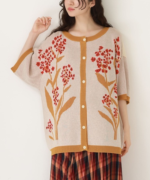 ■デザイン オリジナルの花柄デザインが映える、ジャカードニットのカーディガン。配色のリブ切り替えがメリハリのあるデザインです。貝調ボタンが上品な印象の一枚です。 ■素材 シャリ感のある涼し気なサマーニット生地です。 ■コーディネート 存在感のある花柄で、シンプルなアイテムにさっと合わせるだけで華やかな着こなしに。ボタンを閉じてトップスのようにしても、羽織りとしてコーデにプラスワンしても使える一枚です。