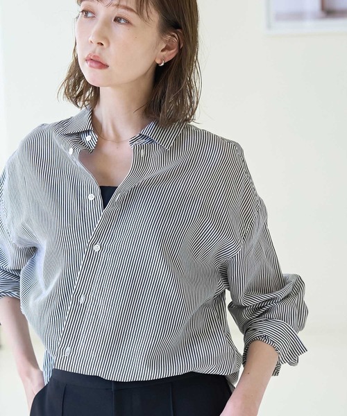 【素材感】 ・シルクの滑らかな肌触りで、着心地◎。 【デザイン・シルエット】 ・肩の切り替えをドロップして、リラックスフォルムで仕上げた長袖シャツ。 ・カシュクール仕立てでも着られる2WAYデザイン。 ・ボトムアウトも決まるラウンドヘム。 【カラー】 カラーによって柄が異なります。 ブラック(01)ネイビー(40):ストライプ ブルー(44):無地 【スタイリングポイント】 ・カシュクールで着るときは、抜き襟にするとこなれ感が出る。 ・羽織としても活用でき、オールシーズン活躍。 ・ハイウエストパンツやアイラインスカートには、裾インですっきりと着こなして。 <カシュクール着用時のポイント> 1,裾をクロスにし、両脇のボタンホールにとめる。 2,第4ボタンと第5ボタンをとめて襟を少し抜く。(こなれ感のある着こなしに仕上がります) 3,裾をボトムにインして、少しブラウジングする。(裾がきれいに収まります) ----------------------------- 裏地:なし 透け感:ややあり 伸縮性:なし 生地感・厚さ:やや薄手 ボタン:全て開閉可能 ポケット:なし 季節:秋~春(ニットのインナーとしても着用可能) ----------------------------- ※撮影時の光、お使いのモニター環境によって色の見え方が違う場合がございます。 ※モデル身長:165cm 着用サイズ:38