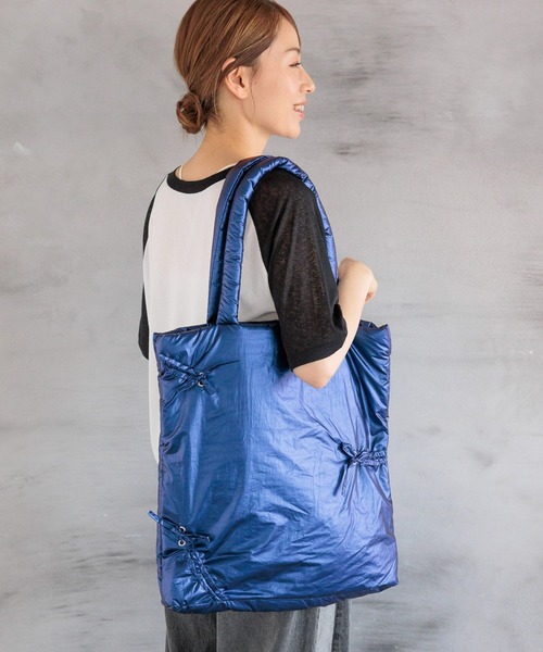 光沢感のあるメタリック素材に、リボンをあしらったトートバッグ。厚みがある生地感ながらも、軽量なのが嬉しいポイント。A4サイズが入り、収納力も抜群です。内側にはポケットがついているので、荷物の整理もしやすいアイテム。普段のコーディネートに取り入れるだけで、トレンド感をプラスしてくれます。