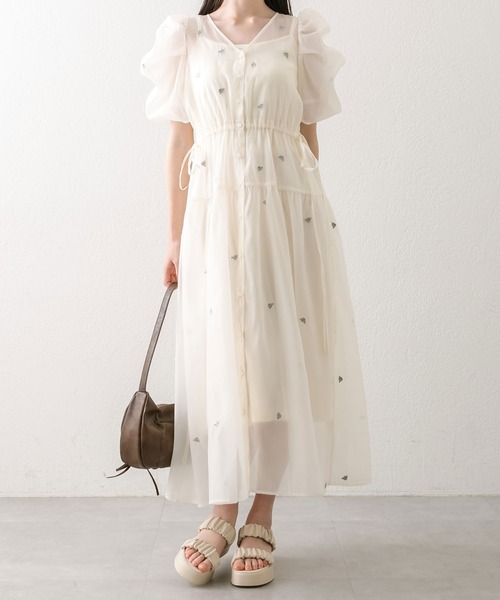 ローズ刺繍とサイドのリボンがかわいいワンピース ■デザイン ・ローズ刺繍がポイントの1枚で着映えるワンピース。 ・Vネックで顔周りすっきり見えし、透け感のある生地で女性らしい抜け感をプラス。 ・ウエストはサイドのリボンで調節ができ、メリハリがつくのでスタイルアップが叶います。 ・ボリューム袖のかわいいシルエットで、気になる二の腕もカバーできます。 ・ボタンを開けたら羽織としても使えて、様々なスタイリングが楽しめます。 ・インナーは肩ひものアジャスターで丈感調節できるので、足元の見え具合をお好みに変えて着用していただけます。 ■カラー ・アイボリー/ピンク/ブラックの3色展開 ■スタイリング ・足元はスポーツサンダルで抜け感をプラスするのがおすすめ。 ・小物次第でデイリーからオケージョンシーンまで活躍できます。 ・前ボタンを開けてデニムパンツとカップ付きインナーにさらっと羽織るのも可愛いです。 ----------------------------- 裏地:あり 光沢感:なし 透け感:あり 伸縮性:なし 手洗い:可能 タンブラー乾燥:不可 アイロン:110℃まで ----------------------------- model:161cm ※着用、お取り扱いの際は、商品についている品質表示とアテンションタグを必ずご確認下さい。 ※ご覧のモニター環境や撮影環境により実際の商品と多少色味が異なって見える場合がございます。 ご理解の程よろしくお願いいたします。 ※裏地はついておりますが、アイボリーは下に濃い色など着用しますと透け感が出てしまいますのでご理解のほどお願いいたします。 ■お気に入り登録のおすすめ 【気になるアイテムを登録】ハートをクリックしてお気に入りに登録すると完売カラーの再入荷やラスト1点の通知、セールの通知を受けとることができます。 【ブランドを登録】新商品や再入荷、セール通知など、いち早くブランドの情報を受けとることができます。