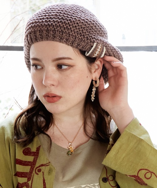 ペーパーヤーンが含まれた涼しげな素材感のニットベレー帽。暑い日に蒸れにくい、ざっくりとした編み地で、自分で形が作りやすい柔らかな肌ざわり。幾何学模様の織りテープがポイント。コーディネートのアクセントに◎※こちらの商品は1点1点職人による手作りとなります。その為、形や色合いなど若干異なる場合がございます。あらかじめご了承ください。※屋外での撮影画像は、光の当たり具合で色味・カラーが違って見える場合がございます。商品のカラーは、スタジオ撮影の画像をご参照ください。Amina Collection Co.,LTD.