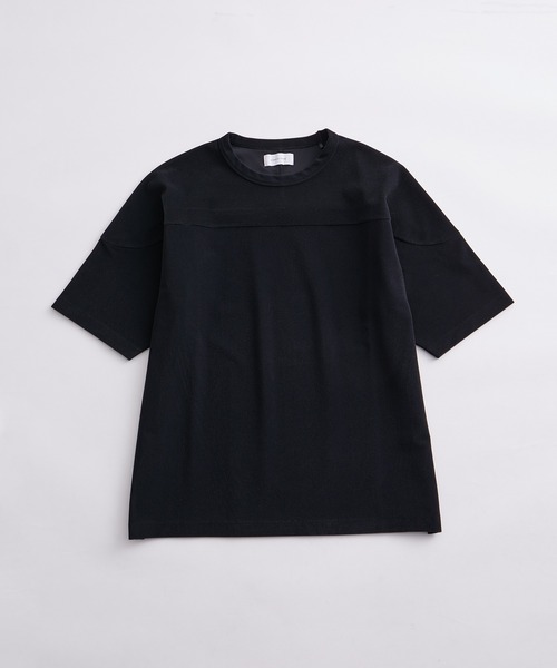 《素材感が織りなす、一枚でも様になるデザイントップス》一枚でもインナーでも良い塩梅のアクセントを加える一枚。 ストレッチもありストレスフリーな着心地も魅力です。 【素材】 コーデュロイ調のトリコットニット素材を使用。 4wayストレッチで伸縮性があるので、秋冬の雰囲気ありながら快適な着用感です。 【シルエット・ディティール】 フットボールTシャツを5分丈にしてコーディネートしやすいデザインにしています。 ストライプのようなタテ畝で、切り替え箇所が意匠性あるデザインに仕上がっているので、ミニマムながら1枚着で存在感ある1着になっています。 【推奨サイズ】 サイズM:身長~175cm サイズL:身長176cm~ ※標準体型を基にした目安になります。 -------------------------- 裏地:なし 光沢感:ややあり 透け感:なし ポケット:なし 伸縮性:あり 生地の厚さ:普通 --------------------------