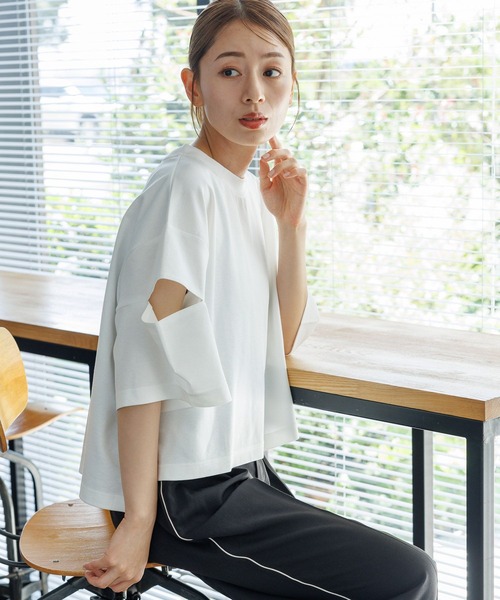 袖部分に切り込みの入ったカットアウトデザインのトップス。さりげなく程よい肌見せが叶う1枚です。サイドにスリットも入っているので、タックインしやすいデザインもポイント。【スタイリング】ジャストの着丈なので合わせるボトムを選ばずスタイリングできるアイテムです。