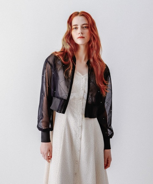【Design & Styling】目を惹くミニパールと軽やかな着心地が魅力のシアーブルゾン。 裾や袖口に細リブを入れ、綺麗めな雰囲気に仕上げました。 軽い素材感なので早めの時期から楽しめるのも嬉しいポイント。 トレンド感のあるコンパクトシルエットでハイウエストボトムや 甘めワンピースなど様々なアイテムに合わせやすいのも魅力です。 同シリーズのスカート(100150044 ミニパールチュールスカート)との 着用もおすすめです。 【Fabric】繊細で高級感のあるチュール生地を使用。 ミニパールはホットフィックス加工で上品な雰囲気に仕上げました。 ベーシックで着回しやすいアイボリー、ピンク、ブラックの3色展開。透け感:あり 裏地:なし伸縮性:なし光沢感:あり アイボリー/ピンク Model:H173cm B80cm W60cm H89cm ブラック Model:H170cm B82cm W60cm H87cm