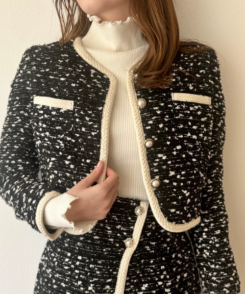 【Design & Styling】クラシカルムード漂うツイードジャケット。 表面感のあるツイード生地と配色のブレードで縁取り 羽織るだけでコーディネートを格上げしてくれるアイテム。 小さめの胸ポケットとビジュー釦がデザインのアクセントに。 コンパクトなサイズ感のため、ワンピースやスカートと合わせたキレイめスタイル、 デニムパンツと合わせたカジュアルスタイルにもおすすめ。 同シリーズのスカート(ツイードパイピングミニスカート)と セットアップで着用するとより華やかな印象に◎ 【Fabric】ウール混なので長いシーズン活躍する生地感。 カラーによって異なるツイード生地とビジュー釦もデザインポイントです。 上品なオフホワイト、シックで大人っぽいブラック フェミニンなベビーピンクの3色展開です。透け感:なし裏地:あり伸縮性:なし光沢感:あり オフホワイト Model:H173cm B80cm W60cm H89cm ブラック Model:H173cm B80cm W60cm H89cm Staff:161㎝ ベビーピンク Model:H173cm B80cm W60cm H89cm Staff:150㎝