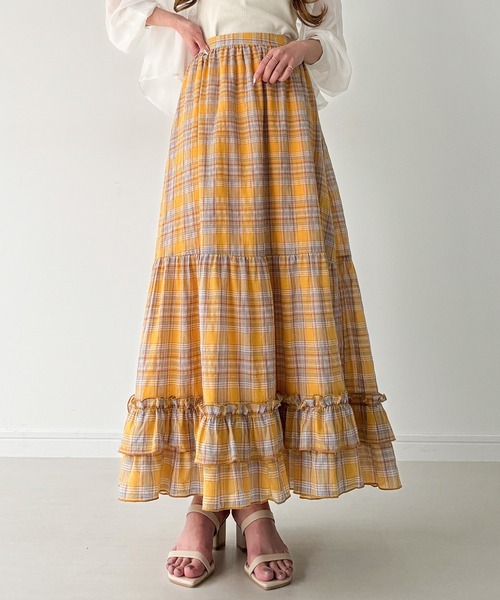 【JUNOAH / ジュノア】※フレア分量が多いため到着時畳みシワが付きやすい商品となっております。予めご了承の上ご検討ください。※全色ペチスカート付き着丈:M47 L49 XL451ウエスト:M66 L70 XL74ビビッドで華やかなチェックティアードスカート。■detailパキッとしたカラフルな色使いが春夏らしいチェック柄スカート。ギャザーたっぷりのティアードデザインや裾フリルデザインで、コーデを明るくかわいらしい印象にしてくれます。ボリュームのあるシルエットでふわっと広がるのも注目ポイント◎インパクト抜群のチェック柄なので、トップスはシンプルなデザインでスカートを主役にしたコーデがオススメ!※左脇ファスナー付き※バックゴム入り■fabric夏に嬉しい、さらりと快適で涼しい薄手綿混素材を使用しております。…………………透け感:あり厚さ:薄手伸縮性:なし裏地:ありシワ:ややなりやすい推奨シーズン:3月~10月※関東の平均気温を目安に推奨シーズンを記載しております。…………………※詳しいお手入れ方法は商品タグをご参照ください。【※必ずご確認の上、ご検討ください※】※通販の特性上、到着時畳みシワが付きやすい商品となっております。予めご了承の上ご検討ください。※当ブランドではデザイナーの感性を大切にし、デザイン性を重視した商品を提案しております。画一的な商品ではなく、最新の生地や仕様で個性に焦点を合わせて展開いたしますのでお気軽にお試しください。※返品・交換規定は当サイトのヘルプをご参照ください。★お買いものをよりお楽しみいただく為に!★▼商品のお気に入り登録お気に入りアイテムの完売カラーの再入荷通知や、ラスト1点の通知、セールの通知も受け取ることができます。▼ブランドのお気に入り登録新商品や再入荷など、クーポン配布などのお得な情報を受け取ることができます。※商品画像は撮影時の光や角度により、実物の色味と異なって見える場合がございます。※撮影はサンプル品を使用しており、表示のサイズ感も実物とは若干異なる場合もございますので、予めご了承ください。※生産時期により色・素材・サイズ感など多少異なる場合がございます。予めご了承ください。